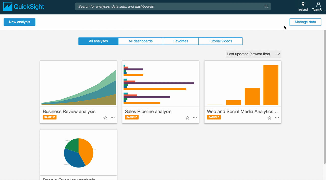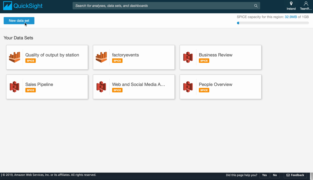 Once you pressed the “Grant” button, you’re all set! The table productiondata.factoryevents is now available for QuickSight to read. Let’s open Amazon QuickSight again.