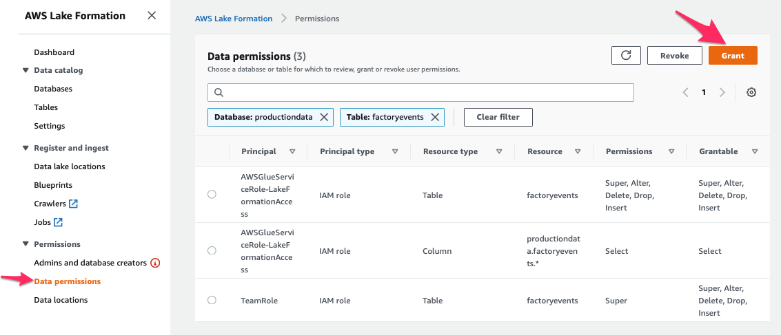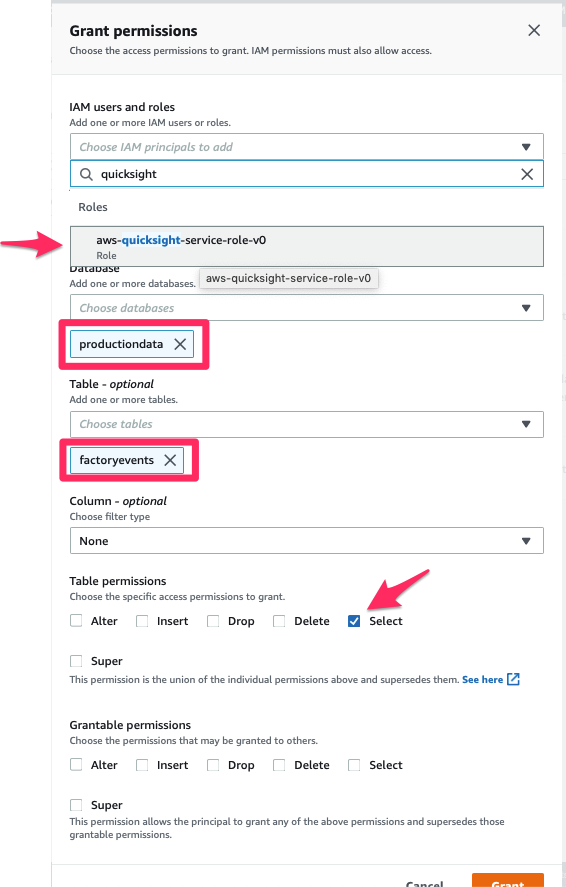 One last time, we had back to the Lake Formation management console and open the “Data permissions” screen (under the “Permissions” header), then grant “Select” permission on the factoryevents table to the Amazon QuickSight service role: