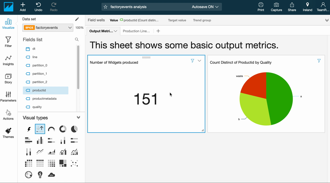 We have seen how to generate simple visualizations based on the data in our factoryevents table and also how to make some modifications to our data set, e.g. changing some of the schema information. You can also do more, like add calculated fields, integrate machine learning to make predictions (based on the existing data) into your data set or join data from different sources directly within QuickSight – that, however, would be out of scope for this workshop.