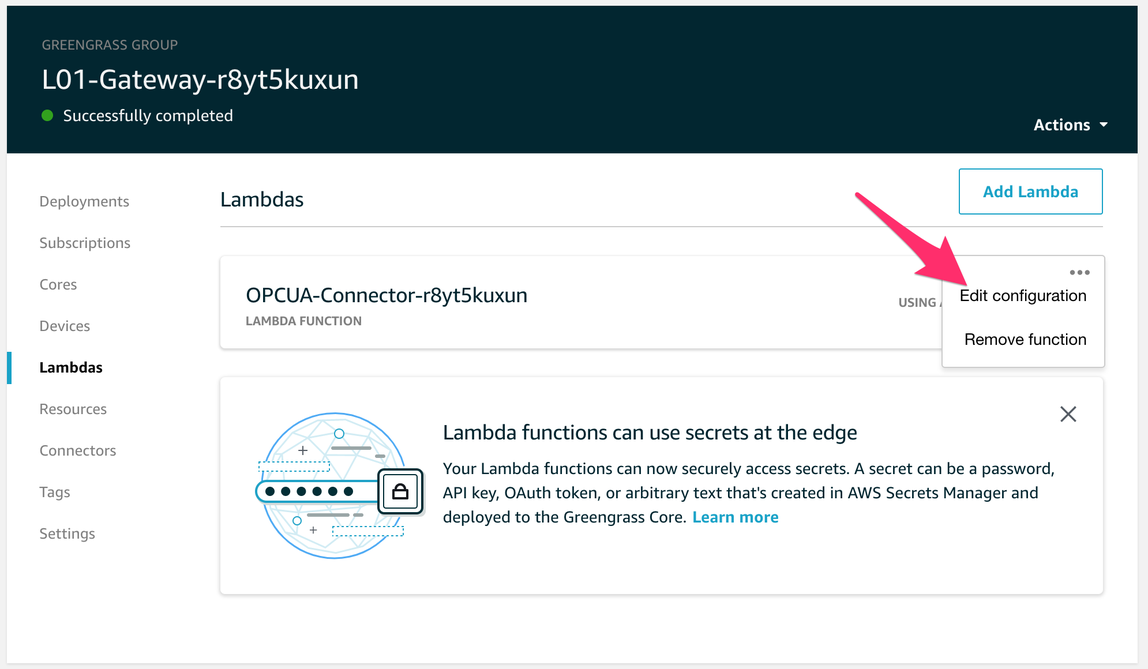 Go again into the OPC UA connector Lambda and there into the configuration: