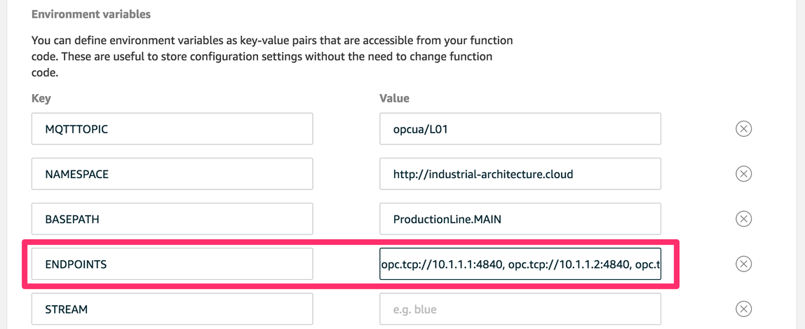 Scroll down to the Environment variables. In the variable called ENDPOINTS add the missing endpoints (separated by commas) of the other PLCs - you should have the following contents in the field: