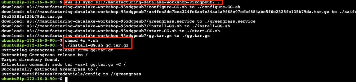 Make sure you are still on the gateway instance with the shell. The next step you will do is install AWS IoT Greengrass on the gateway instance. AWS IoT Greengrass is software that lets you run local compute, messaging between and management of connected devices (like the PLCs in our example), synchronization, and ML inference capabilities on edge devices.