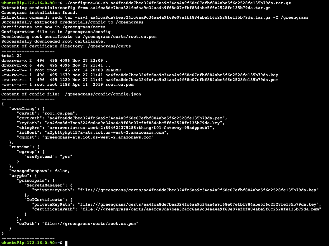 Recall that auto complete will help you entering long file names, i.e., it is sufficient in this case to type “./con<TAB> f94<TAB>”. Note that the file name will be different for every participant. The configure script copies the files in the tar.gz archive into the proper locations for our AWS Greengrass installation and then outputs the configuration that will be used by Greengrass. The output should look similar to the following: