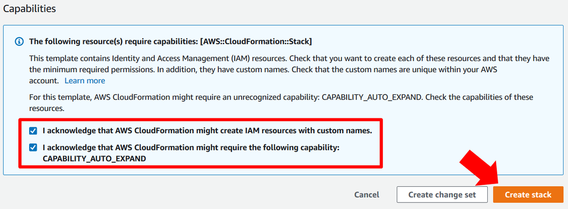 This will open a browser tab/window with AWS CloudFormation which shows some standard options as well as two check boxes which need to be checked: