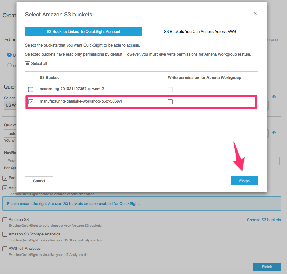 Enter an email address for the occasional notification and then pick the data sources we can use in QuickSight: enable Athena and then click on S3 to select our Amazon S3 bucket.