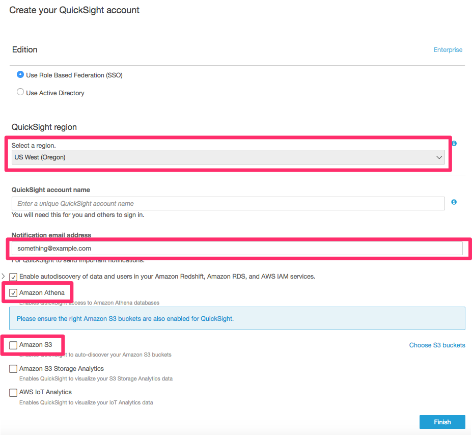 3) Pick basic settings. Most important for us is the region (pick “US West (Oregon)" to colocate QuickSight in the same region as your data) and that we use "Role Based Federation (SSO)" so we can keep using our IAM users in QuickSight and do not have to set up a directory.
